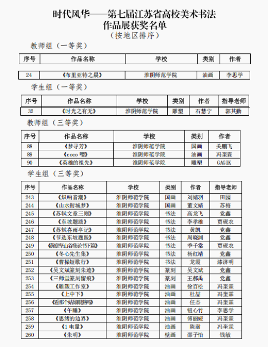 近日,由江苏省教育厅主办的 “时代风华 —— 第七届江苏省高校美术书法作品展” 获奖名单正式公布。美术学院师生表现优异,共23件作品获奖,充分展现了我院在艺术创作与人才培养方面的“以美育人、以文化人”的实力与成效。