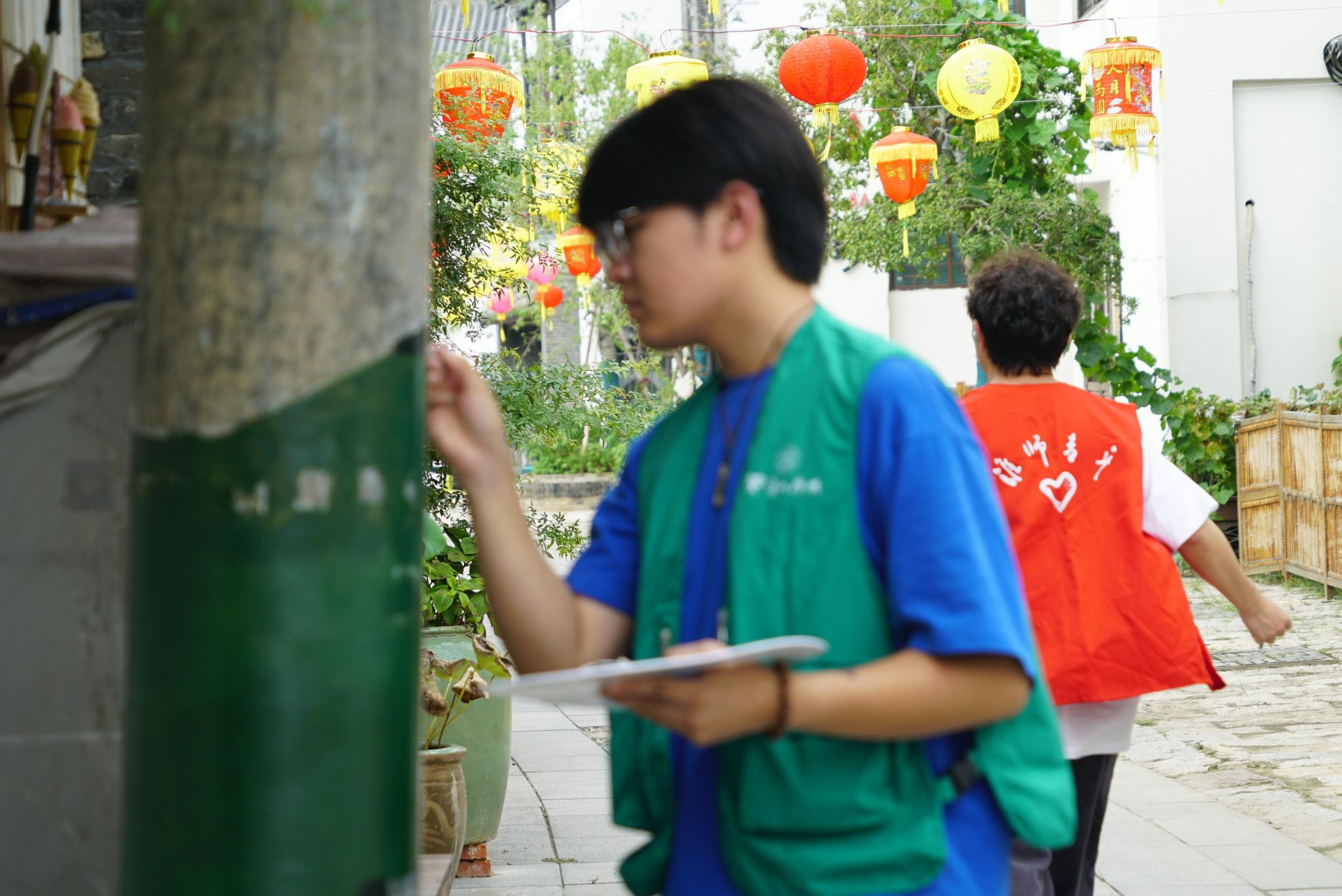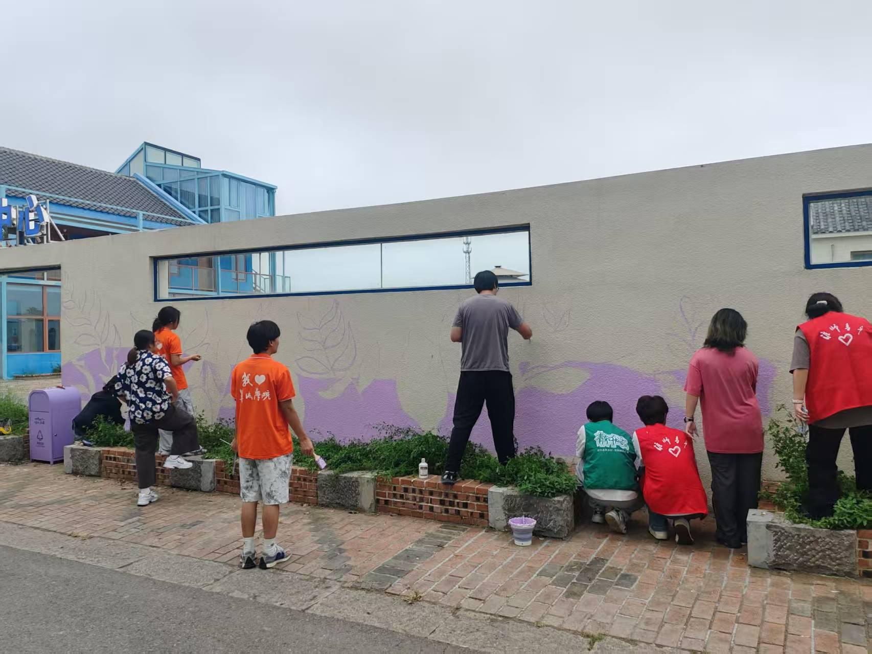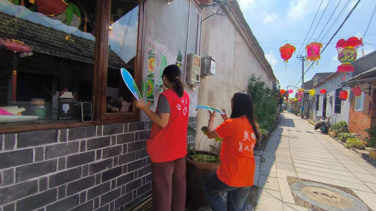 为让墙绘作品精准贴合蒋坝特色,师生团队在实践启动前便精心筹备。他们深入蒋坝的街巷、田间与湖边开展实地调研,走访当地居民,聆听承载古镇记忆的历史故事与民俗传说;细致观察洪泽湖周边的自然景致,将“渔家生活场景”“四季湖景”等充满地域风情的元素纳入创作素材库。调研后,团队围绕“如何用艺术展现蒋坝风貌、为国庆献礼”展开热烈构思,学生结合课堂所学的构图、色彩理论提出青春创意,老师逐一审阅并指导优化,最终确定40余幅墙绘的题材方向,为现场创作奠定坚实基础。