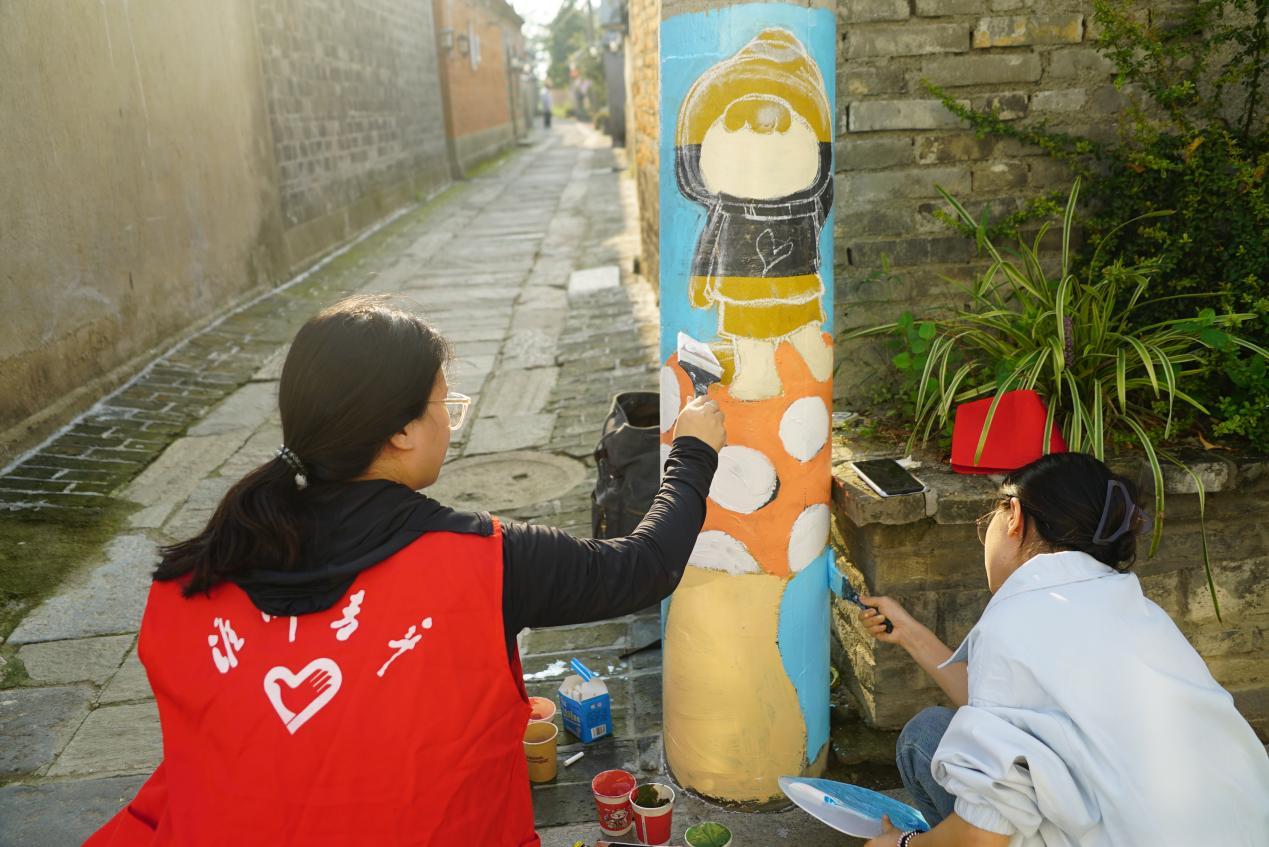 中华人民共和国成立76周年即将到来之际,淮阴师范学院美术学院师生艺术团队在学院领导统筹安排下,由李传林老师带队一行15人走进蒋坝古镇开展主题墙绘实践活动,以艺术专业所长赋能地方文化建设,用鲜活画笔描绘乡村新风貌,为蒋坝喜迎国庆注入浓厚节日氛围。