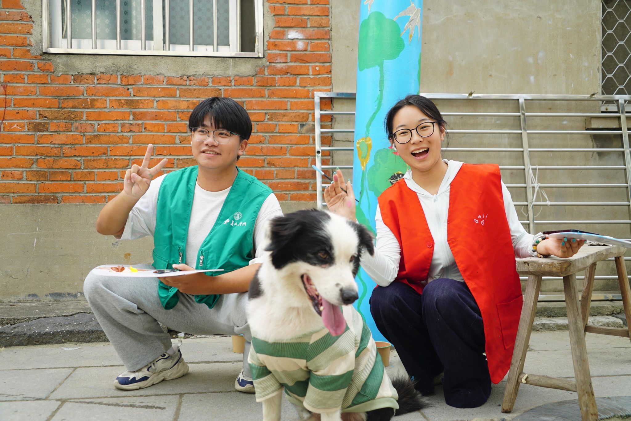 随着国庆氛围日渐浓厚,师生团队正式开启墙绘创作。实践过程中,大家充分发挥美术专业优势,将课堂知识与现场需求深度融合,每一笔都饱含对乡村的热爱与对祖国的祝福。从墙面预处理到构图起形,再到上色渲染,每个环节都有条不紊。老师全程坚守现场指导,针对色彩搭配、细节刻画等问题逐一调整,确保作品既具艺术美感,又能展现蒋坝特色;学生们则分工协作、互帮互助,有的专注打磨墙面、调配明快颜料,有的精心勾勒轮廓、细致填充色彩,遇到高处绘制难题时,还主动搭建辅助设施、轮换作业。在数日的紧密配合中,学生们不仅锤炼了绘画技巧,更用协作的力量加速推进创作,让一幅幅饱含青春活力的墙绘逐渐成型。