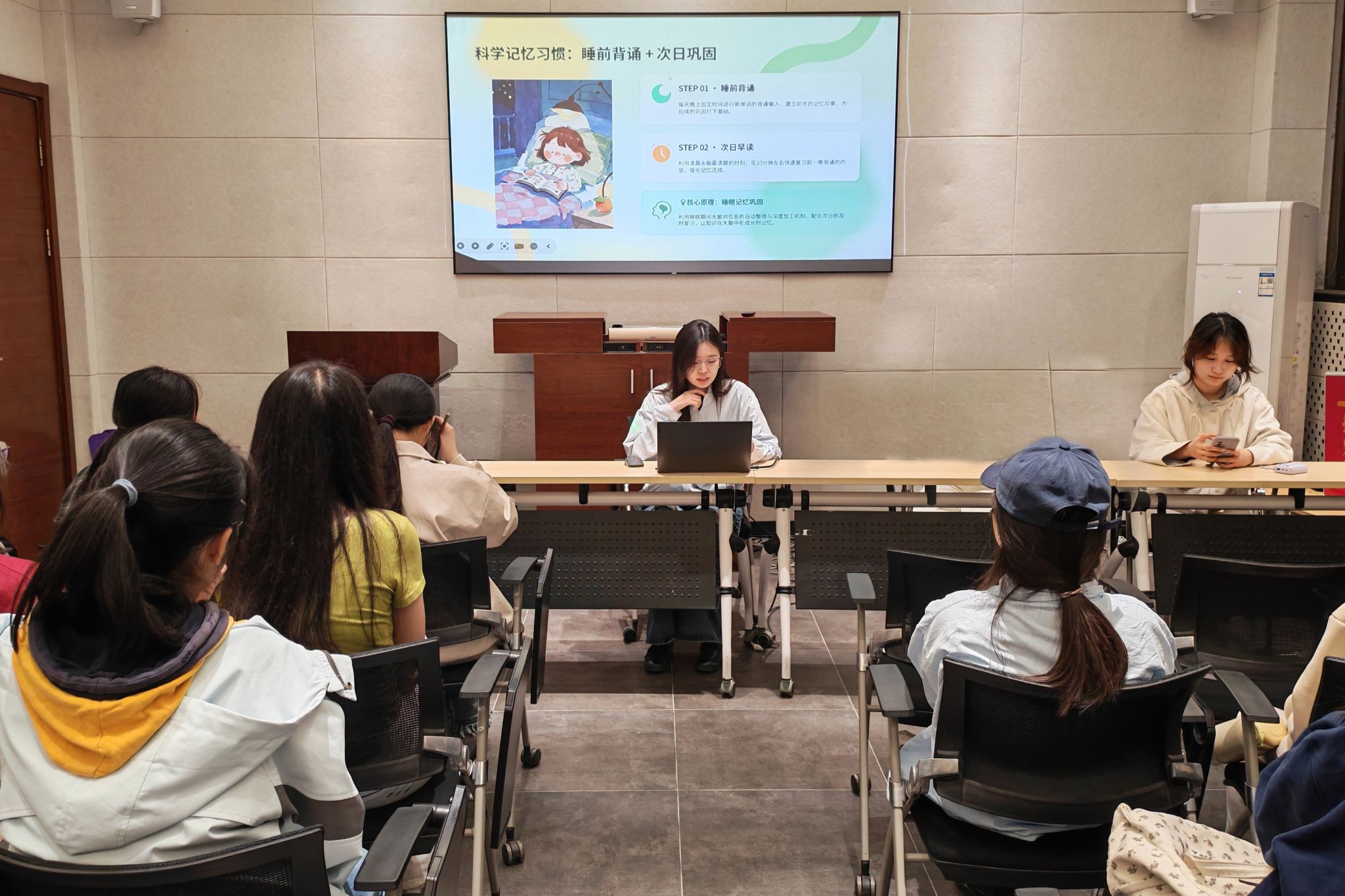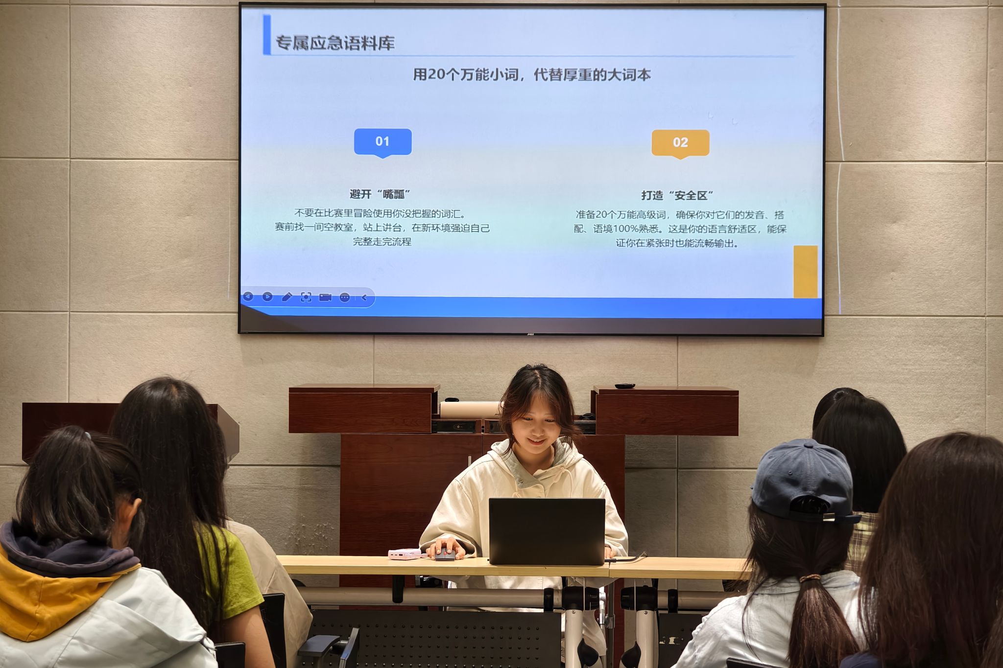 活动中,龚子惠同学聚焦大学生日常英语能力提升,系统讲解了科学的词汇背记方法、高效的学习习惯以及综合提分策略。她引导同学们合理运用智能学习工具辅助词汇积累,通过人机对话强化单词的实际运用能力,帮助大家构建稳定、高效、可持续的英语学习模式。