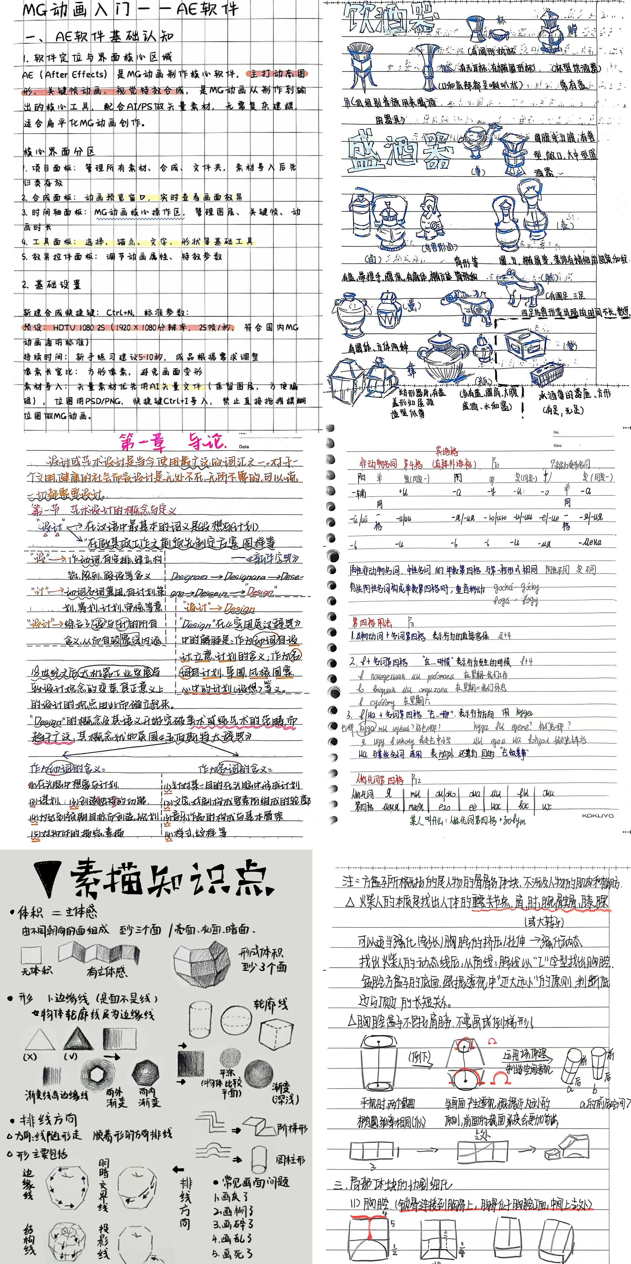 本次参赛笔记涵盖专业学习笔记和自我开拓两个参赛通道,参赛同学通过思维导图、字形结合、彩色标注等科学美观的方式,结合艺术专业特点,形成一篇篇独具匠心的课堂笔记。一段段文字、一道道勾画,内容充实、简洁工整,学生指尖握笔,笔尖触页,记录着与书中知识灵魂对话的过程;一笔一画之间,凝聚着美院学子的勤恳与专注。